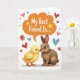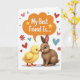 This card shows a small fluffy yellow chick with bright blue eyes leaning in to touch noses with a soft brown rabbit that meets the gaze with the same gentle blue stare, creating a sweet moment of friendship. Their faces sit near the center, close enough that the space between them feels like a quiet promise to stay near. Above them, an orange speech bubble holds the words “My Best Friend Is...” in white lettering, with a few small golden stars nearby. The background stays white and open, letting the pair stand out while keeping the scene light and airy. Around the characters, scattered hearts in red, pink, and light blue add a romantic, caring tone without crowding the main focus 🌷. Small red flower shapes and simple petal marks dot the space, echoing the soft, affectionate mood 🐰. The chick’s down looks lightly textured while the rabbit’s fur appears plush, and both are framed by pastel hearts and tiny red floral accents.