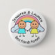 White background with a colorful rainbow starting and finishing at two white fluffy clouds. In front of the rainbow are two cartoon best friends holding hands. One friend is dressed in blue while the other is dressed in yellow. They have little tufts of hair on their heads, little black dots for eyes and a big smile. Templates are placed at the top and bottom of this adorable badge in playful curved text to add your names and message to personalize. Makes a great gift for your BFF.