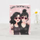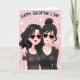 This greeting card shows two young women in an anime-style illustration, standing shoulder to shoulder and hugging close. The background is soft pastel pink with white circles and small pink hearts scattered around, setting a sweet, friendly mood. Both of them wear bright pink, heart-shaped sunglasses with dark lenses, which makes them look ready to celebrate. The woman on the left is laughing with her mouth open and her tongue slightly out, while the woman on the right has a gentle smile and rests her hand on her friend’s shoulder. At the top of the card, the text reads “HAPPY GALENTINE’S DAY” in a friendly script style that stands out clearly against the pink background. The overall scene feels warm and affectionate, like a fun snapshot of close friendship on a special day ❤️💌🍫.