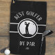Introducing our “Best Golfer By Par” golf towel, featuring a stylish white font with a male golfer silhouette set against a realistic golf ball image on a sleek black background. The design includes a black circle outlined in white, complemented by a matching black band also outlined in white.