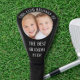 A fun custom black photo golf club head cover for a golfer grandpa featuring. "This Club Belongs to the Best Grandpa Ever" in classic white serif typography and a family photo of his grandchildren.