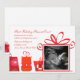 Feature your ultrasound in a Christmas present and send your "gift" to everyone on your mailing list to announce your baby's on the way. The white background has a border of brightly-wrapped gifts and the biggest present is a window for your baby's ultrasound. The card is easy to customize with your wording, font, font color and choice of six paper types.
