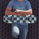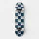 This skateboard features a geometric pattern checkerboard squares design with a triangular motif in a modern, minimalist style. The words BEST M AN are on the skateboard vertically. The pattern consists of alternating metallic blue and metallic silver triangular shapes arranged in a grid formation. The truck width is 5.25. The trucks are all terrain skateboard trucks.
