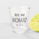 This cool and modern Best Man typography shot glass design is the perfect gift for the Groom's bridal party. It features simple black typography with a personalized date and monogram name. Customize the text color by clicking the "customize" button to access more options.