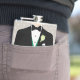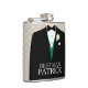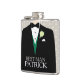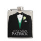 Smartly dressed best man in tuxedo and black bow tie graphic wedding hip flask. Reads Best man Patrick. Personalize with your own name and title. A great personalized gift idea for male bonding on bucks nights / stag nights, wedding rehearsals or as a wedding favor. Art and design by Sarah Trett for www.mylittleedenweddings.com
