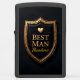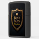 This dark, sophisticated, and symbolic design is a distinguished keepsake perfect for a Best Man, recognizing his strong support and honored position in the wedding celebration. The central image features a bold, layered three-dimensional shield with a matte black, leather-textured center. The entire shield is framed by a thick, polished golden metallic border detailed with rivets, giving the piece a classic, rugged elegance. At the top center of the shield is a small, prominent golden heart, symbolizing affection, loyalty, and devotion. This minimalist, high-impact design focuses on the key elements of honor and support, making the bold, golden text "BEST MAN" stand out vibrantly against the deep black background. This visual powerfully symbolizes the strength, loyalty, and cherished friendship offered by the Best Man. This lighter serves as an upscale, personalized memento to commemorate the special day and acknowledge his critical role in the marriage ceremony.