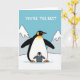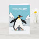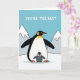 This greeting card shows a stylized icy scene where an adult flightless bird stands tall beside a small chick, their close stance suggesting a steady, caring bond ❤️. The adult has sleek black feathers, a bright white belly, and warm golden-orange markings on the face and upper chest that draw the eye like a gentle glow. At its feet, the chick has a soft gray body, a darker head, and a tiny orange beak, leaning in as if enjoying the safety of being near. The pair faces forward with a calm, trusting look that reads like quiet affection and support. Above them, a pale blue sky holds the message “YOU’RE THE BEST” in white, simple sans-serif lettering centered near the top. On either side, two snow-capped mountains rise with light gray bases, framing the birds without distracting from them 🌼. A wide stretch of white snow fills the bottom portion, giving the illustration plenty of open space and a crisp, wintry finish.