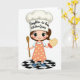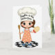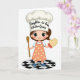 This design shows a youthful cartoon chef with wide dark eyes and rosy cheeks, giving a gentle, friendly smile that feels like a sweet nod of affection ❤️. She wears a tall white chef’s hat with dark lettering centered on the front, showing a family-themed, skill-focused title. Her light blue top sits under a peach apron patterned with tiny frosted treats, adding a cozy, sharing-a-dessert-together kind of closeness. In one hand she holds a wooden spoon angled upward, as if she’s about to stir something made for someone special. Her other hand wears a quilted oven mitt, lifted slightly like she’s ready to pull warm goodies from the oven for a loved one. The background stays bright white, keeping all attention on her confident pose and soft, inviting colors 🌼. Beneath her feet is a glossy round base with a black-and-white checker pattern.