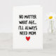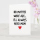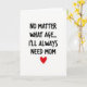 This card features a bright white background with a short message centered in the upper half in thick black letters that look slightly irregular, like confident everyday handwriting. The wording reads, “NO MATTER WHAT AGE... I’LL ALWAYS NEED MOM,” with the ellipsis spaced to give the line a gentle pause. The black text stands out sharply against the empty white space, keeping all attention on the message. The casual letter shapes add a tender, close-to-home feel, as if it were written for someone you’d hug a little longer ❤️. Beneath the text, a single small heart sits centered as a simple sign of affection, like a quiet reminder of a steady bond. The lighting is even and flat with no shadows or extra decoration, so the design feels open and uncomplicated. The heart is a rich red tone that contrasts strongly with the black lettering and white background 🌼.