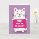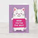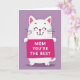 This card shows a rounded white cat centered on a smooth lavender background, smiling with closed eyes and rosy cheeks as if basking in affection ❤️. The cat hugs a deep magenta rectangular sign close to its chest, giving the scene a cozy, caring feel like a warm hug. On the sign, the message “MOM YOU’RE THE BEST” appears in white sans‑serif letters, neatly centered and easy to read. The simple shapes and soft shading add a little depth, making the cat and sign feel gently lifted from the background. With its relaxed posture and sweet expression, the character looks like it’s proudly showing a loving note meant for someone special. The limited palette—white, lavender, and magenta—keeps the focus on the message while still feeling bright and cheerful 🌼. A faint shadow sits beneath the sign and along the cat’s edges, subtly defining the figure against the flat purple field.