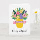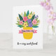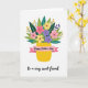 This card features a stylized bouquet centered on the front, rising from a sunny yellow pot like a friendly gift being offered ❤️. Soft pink, buttercup yellow, and gentle lavender flowers fill the arrangement, each with a darker, star-like center that draws the eye. Layers of green leaves—some deep and woodsy, others lighter and fresh—surround the blooms and give the scene a cozy, close-together feel, like friends leaning in for a photo. Small sprigs with round yellow and deep indigo berries add extra texture, like little accents tucked in with care 🌼. A pink ribbon wraps around the top of the pot, and a short message appears across the ribbon in dark, flowing lettering. Beneath the pot, a second line of matching lettering sits centered near the bottom, creating the look of a note signed with affection. The background stays simple so the bouquet stands out, and the pot is a smooth, solid yellow shape with the pink ribbon arcing neatly across its upper edge.