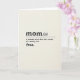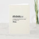 This greeting card features a warm off-white background with a faint, grainy paper texture that feels gentle and inviting. Centered near the top, the large word “mom” appears in thick black lettering, followed immediately by “(n)” in smaller type, with a neat black underline beneath. Under the line, a dictionary-style definition is set in smaller black text, reading “a woman who does the work of twenty for free,” with “free” given extra emphasis for a tender, appreciative touch ❤️. The roomy spacing around the text creates a quiet, intimate mood, like a pause to look at someone you care about with steady admiration. Soft, even lighting keeps every letter easy to read, and the simple layout lets the message feel direct without extra decoration. The text stays centered throughout, with the headline occupying the upper middle and the definition stacked neatly below. A tiny 🌼 could be imagined beside the definition, but the actual design remains purely typographic with black text on creamy off-white.