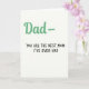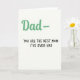 This card features a wide white background with lots of open space, letting the message feel direct and a little cheeky ❤️. Near the top, the word “Dad—” appears in a fresh green color, set in a flowing, handwritten-style lettering that adds a gentle, familiar touch. Below it, centered and taking up more visual weight, the line “YOU ARE THE BEST MOM I’VE EVER HAD” is printed in solid black with simple rounded lettering that reads clearly at a glance. The contrast between the soft green header and the strong black statement creates a quiet back-and-forth, like a teasing grin paired with real affection. With no extra illustrations, the design leans into the tender humor of praising a father figure for caring in a nurturing, mom-like way 🌼. The spacing between the two lines feels intentional, giving the top word room to land before the longer message delivers its twist. “Dad—” sits above, while the longer all-caps sentence is placed beneath it in the center against the plain white field.