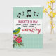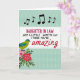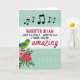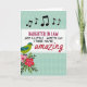 This card features a white rectangular panel centered on a pale teal background, edged with a dashed line that looks like tiny stitches. Inside the panel, a congratulatory message is stacked in uppercase letters in deep magenta and black, followed by a single flowing red word that feels like a kiss at the end of a note ❤️. Above the text, a short row of black musical notes drifts across the top, adding a light, sing-song touch like two friends sharing a tune. The teal backdrop carries a faint diamond lattice texture that softens the space and keeps the focus on the message. In the lower left corner, a small stylized bird in lime green and turquoise leans toward a cluster of flowers as if drawn in by their sweetness. The blossoms mix rosy pink and rich crimson petals with leafy greens, giving the scene a gentle, affectionate garden feel 🌼. The white panel sits centered, with the musical notes near the top edge and the bird-and-flower cluster tucked into the bottom-left corner.