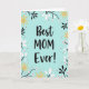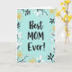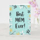 Designed with a light aqua background, this Mother’s Day card draws your eye to the centered words “Best MOM Ever!” in thick black lettering with a flowing, hand-drawn look. The message sits in the middle like a warm hug, surrounded by a border of thin black stems that curl along the edges as if gently reaching inward. Small flowers in soft golden yellow bloom around the frame, each with a tiny coral-pink dot at the center that feels like a little kiss ❤️. Creamy white leaves and small buds fill in the spaces, some tipped with a faint blush pink that adds a tender, caring touch. Scattered coral-pink speckles float across the background like confetti, giving the layout a light celebratory feel without crowding the main text 🌼. The text stays cleanly centered while the botanical details stay mostly around the perimeter, guiding your gaze back to the message. Along the outer edges, the black stems loop and weave between yellow blossoms, pale leaves, and pink specks against the cool aqua field.
