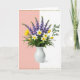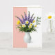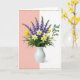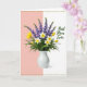 Designed with a bright spring still life, this card centers on a smooth white vase holding a full bouquet that leans toward romance through its soft, close-together blooms ❤️. The background is split down the middle, with a gentle blush pink panel on the left and a crisp white panel on the right, giving the flowers a cozy, balanced stage. Tall violet-blue flower spikes rise upward, while white trumpet-shaped blossoms with sunny yellow centers face outward like they’re sharing a quiet hello. Around them, yellow cup-shaped blooms sit low in the greenery, some partly opening as if caught mid-breath, and the deep green leaves tuck everything in closely. Soft, even lighting highlights the curves of the vase and the petals, creating a calm, affectionate mood without any fuss. On the right-side white area, emerald-green lettering reads “Best Mom Ever,” placed clearly so it stands out against the pale background 👩. Thin dotted borders in a golden-ochre tone run along the top and bottom edges, framing the scene like a gentle trim 🌼. Share Mother’s Day sentiments.