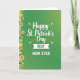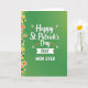 This card features a glowing gradient green background that darkens slightly at the edges, like a soft frame around the main message 💚. Centered near the top, the text “Happy St. Patrick’s Day” appears in white, flowing lettering that seems to float over the green. Just below, “BEST MOM EVER” is set in a simple white sans-serif style, with the word “BEST” placed inside a white banner for extra emphasis. Along the left edge, a vertical border of clovers and small blossoms marches upward in sunny yellow, bright orange, and gentle sage green, each outlined in white. The clustered shapes overlap a bit, giving the side border the feel of a friendly bouquet offered close, as if someone is leaning in with affection. A few orange arrows with white feathered tips point inward toward the words, guiding the eye from the floral edge to the center ☘️. The left border sits tight to the margin, while the arrows angle rightward across the green field toward the white lettering.