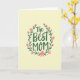 Designed with a pale yellow background, this card centers on the words “The Best Mom” in rich green lettering, placed prominently in the middle. A circular wreath wraps around the message, made of thin brown branches and simple green leaves that lean inward like a gentle embrace. Coral-pink flowers dot the ring, mixing tiny buds with open petals, adding a soft romantic touch like a bouquet given with ❤️. Small dark green dots are scattered between the leaves and blossoms, giving the layout a light, friendly texture. The text sits neatly within the wreath, with the green color echoed by the surrounding foliage for a calm, coordinated look. The overall scene feels warm and close, like a quiet moment shared between loved ones 🌼. The floral ring is evenly spaced, with pink blooms appearing at several points around the circle against the pale yellow field.