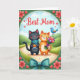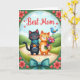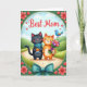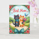 This card shows a sweet illustration set inside an oval frame, where two humanlike cats share a caring moment on a winding path through green hills under a light blue sky with puffy clouds ❤️. On the left stands a smooth, dark gray cat wearing a teal scarf, holding out a golden fish resting in a small blue dish as if offering a gentle treat. Next to it, a striped orange cat cradles a bouquet of roses in pink and purple tones, tied with a ribbon and a tiny tag, leaning slightly closer with an affectionate, grateful look. A small blue bird sits above them, quietly watching the exchange like a friendly witness. Soft, bright lighting rounds out their faces and makes their eyes look warm and attentive, adding a cozy, close-knit feel. Near the top, the words “Best Mom” appear in dark teal, curved to follow the oval’s shape, standing out clearly against the pale sky 🌼. Around the scene, an emerald-green border is decorated with coral-pink flowers and scattered red hearts. A large teal bow sits centered at the bottom of the frame, with looping tails that curl outward beneath the oval.