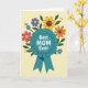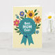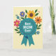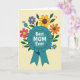 This design shows a teal award ribbon centered on a soft, pale yellow background, giving the scene a sweet, friendly glow ❤️. In the round middle of the ribbon, the words “Best MOM Ever” sit in white letters, surrounded by a dashed outline that adds a gentle, cared-for touch. On both sides, a bouquet of stylized flowers leans in toward the center like a warm hug, with petals in sunny yellow, warm orange, fuchsia, and soft purple, plus a few small sky-blue blooms 🌼. Rich green leaves curl between the blossoms, creating a cozy, togetherness feel as the arrangement nestles close to the ribbon. The text stays neatly contained inside the circular badge, standing out clearly against the teal while the ribbon tails extend downward. Subtle shading gives the ribbon and flowers a little depth without making the layout feel busy. Tiny pink dots are scattered around like light confetti across the pale yellow background.