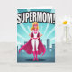 Designed with a modern heroine at center stage, this card shows a confident woman standing tall with her hands on her hips, like she’s ready to take on the day for someone she loves ❤️. She wears a smooth white full-body outfit with strong magenta accents that draw the eye, including a flowing cape that sweeps behind her as if caught by a city breeze. Magenta boots and a fitted belt echo the cape, adding a stylish, put-together look that feels both strong and caring. On her chest sits a stylized magenta emblem shaped like an “S,” hinting at inner strength without naming any specific character. Her blonde hair frames a friendly face, and a magenta eye mask adds a touch of mystery while keeping her expression warm and approachable. The background features a city skyline in muted blue silhouettes, while the sky glows with turquoise rays that fan outward like a spotlight 🌼. Across the top, the words “SUPERMOM!” appear in large white letters, set clearly above her head against the bright sky.