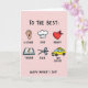 This card features a soft rose background that sets a gentle, affectionate mood ❤️. Across the top, thick black lettering reads “TO THE BEST:” centered near the upper edge, like a headline. Below it sits a neat grid of six simple icons with dark outlines and friendly colors, each paired with a single label that feels like a warm compliment. In the first row, a beige ear is tagged “LISTENER,” a white chef’s hat is marked “COOK,” and a red heart tied with a pink ribbon sits beside “HUGGER,” like an invitation to lean in close. The second row shows an open book with a yellow pencil labeled “TEACHER,” blue-handled scissors labeled “FIXER,” and a small yellow car with a roof sign labeled “TAXI DRIVER,” hinting at steady support in everyday moments 🌼. At the bottom, matching thick black text stretches across the lower margin to say “HAPPY MOTHER’S DAY!” The icons are arranged in two rows of three, evenly spaced, with the heart-and-ribbon graphic standing out in the top row.