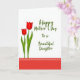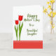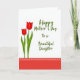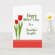 Designed with a wide field of white space, the card keeps the scene airy and easy on the eyes while letting the details speak softly. On the left, two stylized bell-shaped flowers in deep red lean upward on slim green stems, with a few curved leaves that add a gentle, caring touch. Their close pairing feels like a quiet moment between friends or family, like they’re turning toward each other ❤️. On the right side, a short Mother’s Day message sits in flowing green lettering, positioned to balance the flowers without crowding them. The green text echoes the stems and leaves, tying the two sides together in a calm, affectionate way 🌼. Along the bottom edge, a solid red horizontal band grounds the layout and adds weight to the open background. A thin white dashed line runs across that red band, resembling small stitches spaced evenly from left to right.