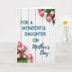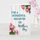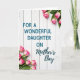 This card features the message “FOR A WONDERFUL DAUGHTER ON” centered across the middle in dark, simple uppercase lettering, setting a steady, affectionate tone. Just below it, “Mother’s Day” appears in a softer, flowing style that feels like a gentle embrace ❤️. Behind the words is a backdrop of distressed white wooden planks with faint vertical grain, giving the scene a cozy, homey texture. In the upper right corner, a cluster of plump fuchsia flower buds leans inward as if reaching toward the message, hinting at closeness and care. A matching floral cluster sits in the lower left, creating a quiet visual conversation between the two corners, like a shared glance between loved ones. Deep green stems and leaves frame the blooms, adding contrast and a fresh, garden-like touch 🌼. The overall lighting is soft and diffused, and the fuchsia buds stand out crisply against the pale wood background.