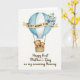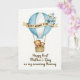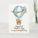 This card features a pastel hot air balloon centered on a bright white background, with soft sky-blue and white vertical stripes that feel calm and airy. A curved golden banner wraps around the middle and carries the uppercase words “BEST MUMMY EVER” in a clear dark lettering, with a small bouquet of muted blue and white flowers and slender green leaves tucked just behind it 🌼. Below, a woven basket holds two plush-like bears, one larger and one smaller, nestled close with rosy cheeks and gentle eyes that suggest a caring, protective bond ❤️. Their bodies lean toward each other as if sharing a quiet, affectionate moment while they ride together. Under the illustration, a line of text reads “Happy First Mother’s Day as my amazing Mummy,” set in a neat, flowing style in a dark gray tone. The overall palette stays soft and light, with gold accents adding a warm glow without overpowering the scene. Fine texture marks on the basket and subtle shading on the balloon give the artwork a delicate, watercolor-like finish. The golden banner sits across the balloon’s midsection, and the bears are positioned side by side in the basket beneath it.
