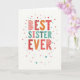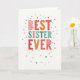 This card features the message “BEST SISTER EVER” right in the center on a creamy white background. The words are drawn in an uneven, hand-drawn lettering style, with each letter filled with its own pattern like polka dots, stripes, chevrons, and cross-hatching. The colors mix coral, orange, and rosy pink with touches of teal, which makes the whole design feel warm and happy. Around the main text, you’ll see little confetti details like red and pink dots, blue stars, and tiny teal hearts floating in the open space. There aren’t any characters or a scene, but the mix of patterns and scattered shapes makes it feel like a small celebration on paper. It’s meaningful to give because it says what you might not always say out loud, and it turns appreciation into something your sister can keep 🥰. The message is easy to read and stands out clearly since it’s placed front and center with lots of space around it ❤️.