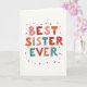 This greeting card features the words “BEST SISTER EVER” centered on a white background, with each letter drawn in a different color and pattern. The text looks like hand-drawn print lettering, and it’s filled with stripes, dots, stars, and tiny details that make the phrase feel lively and caring. The “B” in “BEST” is pastel pink with small stars, and the “E” beside it is red with green polka dots. Other letters switch between orange, teal, and red, including a teal “E” that even has a tiny green chili pepper tucked into the design. Around the main words, small red hearts and little red dots are scattered like confetti, framing the message without distracting from it ❤️. It feels meaningful because it says something simple and direct, while the varied letters show extra thought and attention—like you really want her to feel appreciated. It’s an easy way to share love and closeness with a sister who feels like a best friend 🥰, and it’s perfect for sharing Valentine’s Day sentiments.