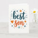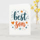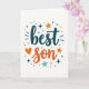 This card features the words “best son” in large, hand-drawn lettering at the center. “Best” is written in deep teal, while “son” is in a warm orange that stands out right away. The letters have a casual, friendly look, like someone wrote them with care. A small orange heart sits near the word “son,” adding a simple sign of love ❤️. Around the words, there are little teal and orange stars, dots, and short lines that look like confetti on a white background. The whole design feels happy and proud, making it a meaningful way to tell your son he’s loved and appreciated 🥰. Share it to help pass along sweet Valentine’s Day feelings.