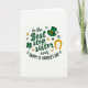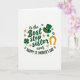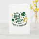 This card features a white background filled with rich green accents and warm gold touches, setting a cheerful St. Patrick’s Day scene 💚. Centered on the front, the message reads “to the Best step sister ever HAPPY ST. PATRICK’S DAY,” arranged in a gentle upward curve that feels like a friendly embrace. The dedication line appears in flowing green lettering, while “HAPPY ST. PATRICK’S DAY” sits just below in simpler, heavier green text for emphasis. To the left of the words, a bright green leprechaun hat with a gold buckle tilts slightly, as if tipping hello. Nearby, a three-leaf shamrock and a golden horseshoe frame the message like lucky charms shared between close friends ☘️. Small gold starbursts and scattered green dots float around the main elements, adding sparkle without crowding the layout. The horseshoe is shown in shiny gold with tiny stud-like details along its curve.