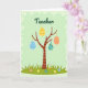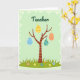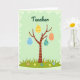 This design shows a slender, stylized tree centered on a pale green background, its bare branches curving upward like gentle arms reaching out. Four decorated egg shapes hang from the branches, spaced evenly as if they’re sharing the spotlight like close friends 🐰. Near the top, the word “Teacher” sits above the tree in medium green lettering, placed prominently and easy to spot. A soft, wavy border in a lighter green frames the scene, with faint swirl details that add a light, airy touch. Along the bottom, a strip of deep green grass grounds the tree, dotted with tiny flowers in pink, yellow, blue, and orange 🌷. Each hanging egg has its own pattern—yellow with red zigzags and dots, blue with wave lines, teal with scattered polka dots, and orange with small yellow spots. The tree stands upright at center, with the four eggs dangling at different heights beneath the arched branches.