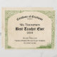 A beautiful 8 1/2 x 11 Certificate of Excellence for the Best Teacher Ever. Designed with a woodland style woodcut print. This certificate is personalized with the teacher's name and the year, along with the students name, grade, and school name. Add you own frame (or not) and this inexpensive certificate becomes a gift your child's teacher will cherish for years to come.