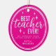 Best Teacher Ever Pink Script Retro Ceramic Ornament. Celebrate your amazing teacher with this heartfelt 'Best Teacher Ever' ornament! This vibrant pink, text-based design features elegant white script proclaiming gratitude and appreciation. It also includes a space for a personalized message, and space for the student's name, making it a truly special keepsake. This ornament is a perfect way to show your teacher how much they mean to you and acknowledge their dedication to helping students flourish. It's an ideal holiday or Christmas gift to commemorate their impact.