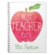 Best Teacher Ever Red Apple Personalized Notebook. Red watercolor apple with green leaf and stem with words best teacher ever inside. Personalize with teachers name in green. A thoughtful personalized gift for your favorite teacher. Edit text to say principal or other school staff.