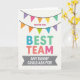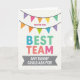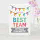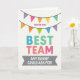 This card features a festive layout with two curved garlands of tiny triangular flags stretching across the top, setting a friendly, together-we’ve-got-this mood 🌷. The flags alternate soft pastel shades like lavender, rosy pink, tangerine, sunny yellow, leafy green, and calm teal over a cream background speckled with small dots. Centered in the middle, the large headline reads “YOU’RE THE BEST TEAM,” with big letters that shift through aqua, mint, coral, and fuchsia, like a gentle color fade across each word. The message feels like a close partnership, as if two people are standing shoulder to shoulder and smiling at each other while reading it 🐰. Beneath the headline, a long deep gray banner runs horizontally and holds the line “ANY BUNNY COULD ASK FOR!” in crisp white lettering. The strong banner adds weight and structure, while the pastel flags keep the scene light and friendly. The dotted cream background fills the space evenly, with the garlands hovering above the colorful headline and the gray strip sitting neatly below it.