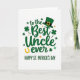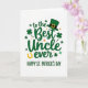 This greeting card features a white background with rich green lettering that reads “to the Best Uncle ever,” with the words arranged in a stacked layout and shaded with darker green to give a gentle depth. A jaunty leprechaun hat sits above the word “Best,” colored green with a black band and a gold buckle, like a friendly tip of the hat ☘️. Beneath the main message, “HAPPY ST. PATRICK’S DAY” appears in smaller, straightforward green text, centered and easy to spot. Shamrocks in several sizes float around the words, angled in different directions so the space feels lively without being crowded 💚. Small orange stars are sprinkled between the clovers and letters, adding tiny points of sparkle that draw your eye across the design. Near “ever,” a golden horseshoe dotted with little red marks adds a lucky accent and balances the hat at the top. The overall layout keeps the text as the focus while the icons frame it like a cheerful surround. The green hat, scattered shamrocks, orange stars, and the gold horseshoe stand out crisply against the bright white background.