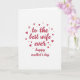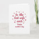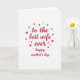 This card features a white background with a flowing, cursive-style message centered on the front that reads “to the best wife ever happy mother’s day.” The lettering uses shades of red, moving between deep crimson and softer rosy tones, giving the words a tender, affectionate feel ❤️. The phrase sits as the main focal point, with “to the best wife ever” appearing above and “happy mother’s day” following beneath in the same style. Small heart shapes are scattered around the text, as if gently drifting in a loose circle, adding a sense of closeness and romance without crowding the layout. The hearts vary in size and color, shifting from light pink to ruby red with a few peach accents, like a soft shower of affection. The overall look stays simple and airy, letting the red tones stand out strongly against the white while still feeling gentle and warm 🌼. Several hearts appear near the top right and lower left of the message, with a few smaller ones tucked between the words.