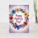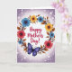 This card features a circular wreath of flowers and branches that feels like a gentle hug around the center message ❤️. “Happy Mother’s Day!” sits in the middle in ruby-red flowing lettering, with the words following a neat, centered layout. Around it, stylized blooms in blue, sunny yellow, and deep red nestle into earthy brown twigs, each flower marked by a darker, textured center that adds depth. Rust-colored leaves tuck between the branches, giving the ring a cozy, caring look, like a garden arranged with affection. At the bottom of the wreath, a violet butterfly rests with wings spread, its dark veins drawn in fine lines that suggest a soft, tender pause. The background fades from pale lavender toward deeper purple near the edges, keeping the focus on the wreath and message. Scattered across the backdrop are small, blurry white light-orbs that resemble glowing specks and a few faint sparkles 🌼.
