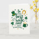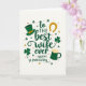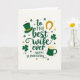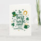 Designed with a St. Patrick’s Day theme, this card centers on a tall stack of lettering that reads “To THE best wife ever HAPPY St. Patrick’s Day,” arranged down the middle like a toast meant for two. “To” and “best wife ever” appear in flowing green lettering, while “THE” stands out in darker green capitals and “HAPPY St. Patrick’s Day” sits beneath in a friendly, easy-to-read style. A creamy white background sets off the greens and golds, giving the message room to breathe as if it’s spoken softly and meant just for her 💚. In the top left, a green leprechaun hat with a gold buckle tilts in, like a wink across the page, and in the top right a gold horseshoe balances the layout with a lucky shine ☘️. At the bottom right, a frothy green beer mug anchors the corner, adding a cozy pub-night touch that feels like shared laughter. Small shamrocks scatter around the text, mingling with gold and deep-green dots that look like confetti caught midair. The overall look is flat and graphic, with crisp shapes, scattered clovers, and sparkling dots surrounding the centered message.