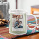 Modern contemporary 5 photo collage custom family template coffee mug in pastel sage green and white with a trendy typography style. +++++++++ Personalize it with 5 family shoots and your name and text! +++++++++++++++ It can be a beautiful savor the memory keepsake gift for New Year, Christmas, anniversary, new home, mom, dad, grandma or grandpa's birthday, or any other festive family occasion.