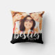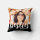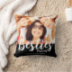 Modern besties photo throw pillow with names. Replace the photo with your own and change the text. Photo and text on front and back of pillow. Makes a great gift idea. White typography on black background.