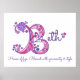 Pretty B monogram art name poster perfect for a girls bedroom or playroom in shades of gray, white, yellow, pink and purple. Personalize with your child's own short name beginning with B, and name meaning for a truly personalized touch to your child's bedroom or nursery, this example is for the name B Beth House of figs. Blessed with generosity and style. Cute poster print ideal for a new baby, christening or baby shower gift. © Unique letter B monogram hearts and flowers drawing and graphic art design by Sarah Trett. www.sarahtrett.com for www.mylittleeden.com