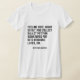 My overall review is that the T-shirt is nice, it fits true to size however the font is significantly smaller than advertised and you can't read it. The printing is unreadable and there is a strain to read it. It does not look like the advertised product. Maybe the shirt color is darker or a larger more visible font should have been used. Photos with and without flash and font is barely legible.