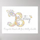 Pretty B monogram art name poster perfect for a girls bedroom or playroom in shades of gray, white, yellow, pink and purple. Personalize with your child's own short name beginning with B, and name meaning for a truly personalized touch to your child's bedroom or nursery, this example is for the name B Betsy Exquiste, blessed with flair, totally adorable. Cute poster print ideal for a new baby, christening or baby shower gift. © Unique letter B monogram hearts and flowers drawing and graphic art design by Sarah Trett. www.sarahtrett.com for www.mylittleeden.com