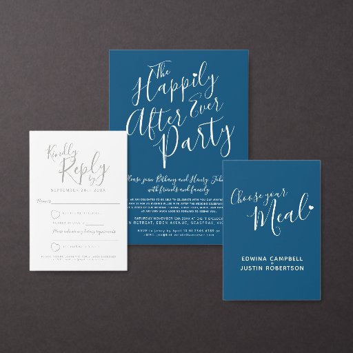 Plain white envelopes are included with paper invitations and will come to fit the invitation size you select. If you don’t need the envelopes, you may choose to not receive them by selecting the dropdown below "Envelopes" and choosing "None." If you’d like to have a design on your envelopes, you can browse all of these available envelopes to find the design that complements your Better Late Than Never Wedding Party Dark Blue Invitation.