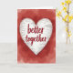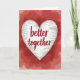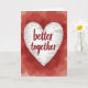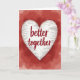 This card features a large cream-colored heart centered on a background made of many shades of red. Inside the heart, the words “better together” appear in red cursive-style handwriting, placed right in the middle. The heart has light horizontal line shading across it, giving it a drawn, textured look. The red background isn’t flat, and it has soft, uneven patches that make it feel warm and cozy. With the simple heart shape and the close, loving message, it fits romance, affection, or even close friendship. The red text stands out clearly against the pale heart, making the message easy to notice at first glance.