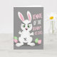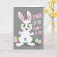 This design shows a stylized white bunny 🐰 standing confidently against a smooth, muted gray background, with long ears tipped in soft pink that add a gentle contrast. Its bright green eyes and sharply arched dark brows lock into a direct gaze, and a small red nose and open smirk with a single tooth give it a teasing, flirty edge, like it’s sharing an inside joke with you. To the bunny’s side, the phrase “BEWARE OF THE BUNNY KICKS” appears in a simple graphic font, set in crisp white with touches of pale pink that echo the ear color. The words sit close enough to feel like part of the character’s attitude, as if the bunny is delivering the warning with a wink 🐇. Near the feet, two decorated eggs bring a seasonal touch, one in light green with lighter stripes and the other in soft pink with white stripes. A small hand-drawn “X” mark sits on the lower torso, adding a slightly rebellious note without overpowering the soft palette. Subtle drop shadows under the bunny, the lettering, and the eggs give a slight lift from the flat gray field.